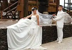 Marriage today has been influenced by many of the revolutionary and feminist movements that have occurred in the twentieth century. Such reforms focused on women and family. For example, the efforts to end foot binding, the movement to secure rights to education for women, and the campaigns to allow women into the work force, alongside other changes all challenged the traditional gender role of married women.[4] However, in practice, women are still responsible for the majority of domestic work and are expected to put their husbands and families first.[5] Working-class women are often forced to juggle the double burden of doing the majority of the household labor with the waged work they must do to support their families.[5] In particular, the May Fourth movement called for men and women to interact freely in public, and to make marriage a free choice based on true love. This freedom of choosing one's spouse was codified in the 1950 Marriage Law, which also outlawed arranged and coerced marriages.