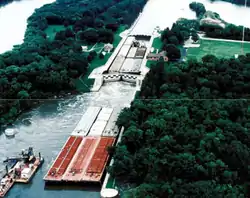 The Marseilles Lock and Dam, also known as Lock and Dam 5, is a lock and dam complex on the Illinois River at Marseilles, Illinois. The complex includes a lock, dam, control station, boiler house, and a 2.5 miles (4.0 km) section of navigation canal. The state of Illinois began work on the complex in 1920 by digging the canal, which was completed in 1925. The state also began construction on the lock, dam, and control station; however, due to financial difficulties these projects were finished by the U.S. Army Corps of Engineers. Walter Mickle Smith was chief design engineer for the complex. The complex was completed in 1933.[2][3] The lock has a drop of 24 feet (7.3 meters).
