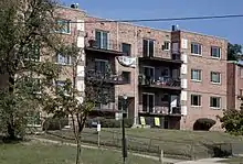 Limited redevelopment efforts have occurred in Marshall Heights since 1990. In 1989, the Marshall Heights Community Development Organization (MHCDO) secured financing from the Local Initiatives Support Corporation (LISC) and purchased four empty lots[71] on the 5300 block of Drake Place SE.[68] The MHCDO built four houses there and sold them to low-income families.[71] But many homes in the neighborhood were still in poor condition. As late as 1995, Marshall Heights still contained a number of home-made houses with sheet metal roofs.[9] Most of the notorious Eastgate Gardens was razed in 1998, and the remainder in 2002.[72] A new public housing development, Glenncrest, opened on the site in 2008.[73] In 2010, the nonprofit National Housing Trust purchased Copeland Manor (Benning Road SE, C Street SE, and 49th Street SE), a 61-unit apartment building. The apartment building became a cooperative, and National Housing Trust agreed to a lease-to-buy arrangement with the tenants' cooperative.[11][74] In 2011, the city took title to the Bass Circle Apartments (Benning Road SE, B Street SE, and Bass Place SE), a five-building, 119-unit apartment complex whose owners had defaulted on their mortgage. The tenants partnered with Bass Apartments LLC, a subsidiary of Telesis Corp., to obtain a $4.843 million loan and rehabilitate the complex.[11][75]