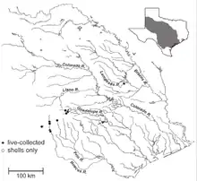 Records published by Hershler & Liu (2011)[2] considerably expanded the geographic range of Marstinia comalensis, which lives in springs and fluvial habitats spread among four river basins in south-central Texas.[2] Almost all of these localities are on the Edwards Plateau.[2] Records indicate that Marstonia comalensis was historically distributed in the upper portions of the Brazos River, Colorado River (Texas), Guadalupe River (Texas) and Nueces River basins, south-central Texas.[2] The species has been live collected at only 12 localities and only two of these have been re-visited since 1993.[2]