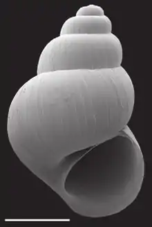 The shell is ovate-conic with 4.5–5.5 whorls.[2] The height of the shell is about 2.6–4.6 mm.[2] Protoconch is near planispiral, slightly tilted, initial 0.75–1.0 whorl strongly wrinkled.[2] Teleoconch whorls are weakly convex, often narrowly shouldered, rarely having subsutural angulation.[2] The sculpture of strong collabral growth lines, later whorls having numerous weak spiral striae.[2] The aperture is pyriform or ovate.[2] Inner lip complete across parietal wall in larger specimens, usually narrowly adnate, rarely slightly disjunct; usually thin, sometimes slightly thickened apically; columellar shelf absent or very narrow; outer lip thin or slightly thickened, orthocline or prosocline.[2] Umbilicus is open but small.[2]