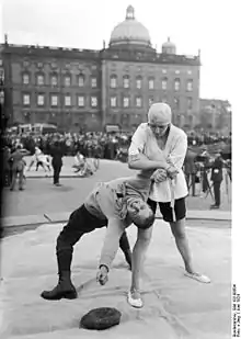 Demonstration of a Ju-Jitsu defense against a knife attack. Berlin 1924