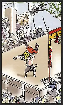 A Chinese martial artist preparing to throw his opponent during a lei tai contest in Ancient China.