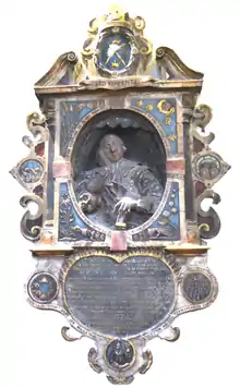 In 1634 Blake erected the surviving mural monument in St Peter's Church, Barnstaple, to his nine-year-old son Nicholas Blake (d.1634) and other children, but "as much in allusion to his own position and sufferings", described by Chanter (1882) as "perhaps the most noteworthy and interesting monument in the church", "not only a work of art, but of allegorical literature and imagination, telling its tale as fully in its medallions, cartouches and sculptured mottoes as if written - an actual instance of 'sermons in stone'".[38]