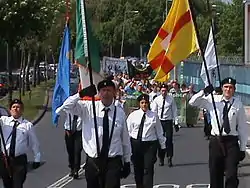 The IRA issued a statement that Doherty had been a member of the organisation, saying that he "died heroically in the defence of others at Widow Scallans . . . his courage and quick thinking during the attack undoubtedly saved many lives".[4][10] As Doherty's coffin was being removed from his home in Finglas a paramilitary display took place, with a ten-strong IRA colour party dressed in leather jackets and berets saluting his coffin, which was draped in the Irish Tricolour with a beret and pair of black gloves placed on top.[11] Doherty was buried at Glasnevin Cemetery,[1] where Martin McGuinness gave the oration, stating: