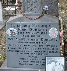 An inquest into Doherty's death in November 2004 returned a verdict of unlawful killing by person or persons unknown.[13] In 2006 a Garda superintendent stated the investigation into Doherty's death was ongoing, and that "We still have an unsolved murder and the file remains open. To date, no one has been made amenable".[14] Doherty's family believe the Irish authorities are withholding key information about the case, and are demanding answers from the Irish government.[14] Sinn Féin justice spokesman Aengus Ó Snodaigh pledged to raise this issue with the Minister for Justice, Equality and Law Reform, stating "Clearly the Irish government has very serious questions to answer about the ability of unionist death squads, led frequently by British agents, to attack and target Irish citizens with apparent impunity in this jurisdiction".[14] Doherty is regarded as a martyr by Irish republicans, with the Clonakilty cumann of Sinn Féin and the Martin Doherty Republican Flute Band named after him,[15][16] as well as the Nassau County chapter of the Irish Northern Aid Committee in the United States.[17] An annual commemoration march from the Dick McKee memorial in Finglas village to nearby Glasnevin Cemetery takes place each year.[10][18]