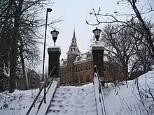 The 50-acre (20 ha) main campus is located at the highest point in New Ulm, between Hermann Heights Monument and Flandrau State Park.[4] Most of MLC's academic and administrative operations are located within the college's Old Main, dedicated in 1884, the Wittenberg Collegiate Center, dedicated in 1928, and the Link, connecting Old Main to the Wittenberg Collegiate Center, dedicated in 1995.[80][81] The Old Main was added to the National Register of Historic Places in 1979, after being nominated as a leading example of Gothic Revival architecture in Minnesota and a distinctive symbol of local religious education.[82] The main campus also includes the Luther Student Center, Music Hall, Music Center, the 1200-seat Chapel of the Christ, a 900-seat auditorium (within the Wittenberg Collegiate Center), a gymnasium, a library, four residence halls, and several faculty homes.[4] The college's library cooperates with the Traverse des Sioux Library System.[83]