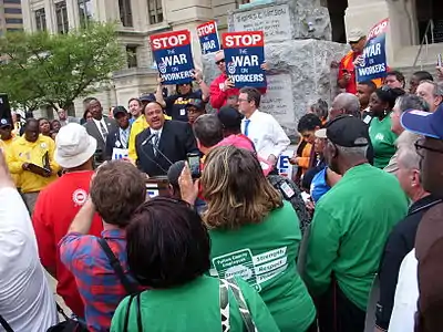 On April 4, 2011, the 43rd anniversary of the assassination of his father, King helped to lead nationwide demonstrations against initiatives to eliminate and undermine collective bargaining rights of public workers in Wisconsin and other states. King led a mass march in Atlanta and spoke to a crowd of supporters at the Georgia state capitol, urging them to "defend the collective bargaining rights of teachers, bus drivers, police, firefighters and other public service workers, who educate, protect and serve our children and families". On November 17, 2011, King and AFL–CIO President Richard Trumka co-authored an article for CNN, calling for reforms to end oppressive immigration laws.[41]