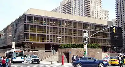 The Martin Luther King Jr. Educational Campus is a five-story public school facility at 122 Amsterdam Avenue between West 65th and 66th Streets in Lincoln Square, Manhattan, New York City, near Lincoln Center. The campus is faced on Amsterdam Avenue by a wide elevated plaza which features a self-weathering steel memorial sculpture by William Tarr.[1] The same steel was used by architect Frost Associates in the curtain wall of the building,[1] the interior of which has an arrangement of perimeter corridors with floor-to-ceiling windows, leaving many classrooms on the inner side windowless. The school is across West 65th Street from Fiorello H. LaGuardia High School of Music & Art and Performing Arts.