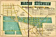 The opening of the railway line joining Wanganui to Palmerston North in 1878, now part of the North Island Main Trunk railway (towards Palmerston North and Auckland) and the Marton - New Plymouth Line (towards Wanganui), turned Marton Railway Station into a thriving railway junction, and it held that position for the next 100 years. The move of the railway station in 1898 was followed by a large development of 'Marton Extension', to the south east, from 1907.[5]