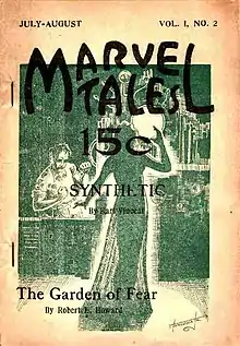Two months later Crawford issued the first issue of Marvel Tales, dated May 1934. This included material that had been planned for Unusual Stories, so it seemed that this was the same magazine under a new title.[9] David H. Keller's "Binding Deluxe", which was horror, rather than sf, appeared, along with a story by H. P. Lovecraft, "Celephais",[6][9] that had previously only been published in an amateur magazine edited by his wife, Sonia Greene.[13] A second issue of Marvel Tales, which Crawford printed with two different covers, appeared a couple of months later, dated July/August 1934, with the number of pages increased from 40 to 60.[9][14] This featured stories by Frank Belknap Long and Manly Wade Wellman, along with Robert E. Howard's "The Garden of Fear", printed under the pseudonym "James Allison";[9] this was the only publication of "The Garden of Fear" until Crawford reprinted it in an anthology in 1946.[15] Crawford also announced a story competition.[5] The third issue, dated Winter 1934, increased in size again, this time to 68 pages. "The Titan", by P. Schuyler Miller, which had been advertised in the original flyer for Unusual Stories, began serialization, and Robert Bloch's first published fiction, "Lilies", appeared, along with "The Golden Bough" by David H. Keller.[9] Four winners of the story competition were announced, though only two ever saw print: Crawford printed "The Elfin Lights" by W. Anders Drake (a pseudonym for Eshbach), and R. DeWitt Miller's submission, "The Shapes", appeared in Astounding Stories the following February.[5][16]