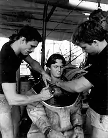 ![]() Photo from 1980 at Naval Diving and Salvage Training Center in Panama City, FL. Mary Bonnin, accompanied by First Class diving students Walt Boyd and Chuck Bloomer, preparing for a Mark V mixed gas training dive. | |