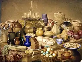 Contrary to the common practice of her day, Mary Ellen Best was interested in portraying domestic life in her paintings, including families at tables, kitchens, and domestic workers.[4] She painted a number of water-colour images of her home in Castlegate, York, including interior portraits of the drawing room, dining room (painted in 1838), and one of herself working in her painting room. She also painted other houses including the drawing room of Naburn Hall, which was then home to George Palmes. After marrying Johan Anton and moving to Nuremberg, Frankfurt, Worms, and Darmstadt, she continued to paint the houses they lived in.[3]