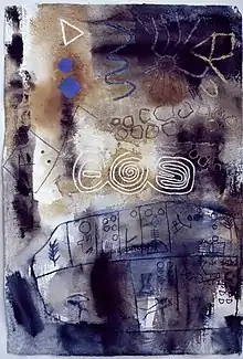 Lloyd Jones's work is greatly inspired by the landscape in which she grew up, a prominent feature of which is the scarred landscape associated with a legacy of lead mining. This sense of place is further augmented by her own Welsh-language cultural inheritance. Ann Price-Owen has referred to her work as that of a custodian of her cultural heritage, which is implicitly language-based.[5] Experiences outside Wales have also provided key stages in her work's development. An interest in early alphabets was precipitated by a visit to Ilkley Moor to view cup and ring marks.[6] Incorporation of such marks into the work led to an identification with the 18th-century Welsh bard, scholar and antiquarian Iolo Morganwg, who created his own bardic alphabet, "Coelbren". She regards the use of scripts such as the ancient ogham script in her work as an oblique reference to the otherness of Welshness. Iwan Bala argues that these works demand some form of contextualising, revealing the artist's concerns and her position within her own culture.[7] In the Summer of 2009 Ruthin Craft Centre showed Lloyd Jones's early textile work, which led to a re-evaluation of this work by a new audience.[8] A second show in 2013 was reviewed in the magazine Embroidery.[9] In February 2013 she was awarded the first Artist Residency at the Old College, Aberystwyth University, and moved into a new studio there.[10] Some of her paintings are in the public collections of the National Library of Wales, Amgueddfa Cymru – National Museum Wales and Cardiff University.