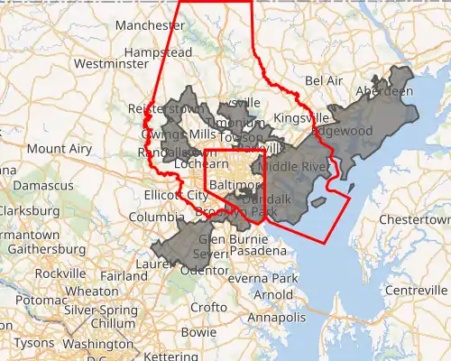 Interactive map of district boundaries (Baltimore and Baltimore County highlighted in red). In the 2020 redistricting cycle, the district is moved out of Anne Arundel, Harford, and Howard counties and into much of Baltimore's northern suburbs and most of Carroll County. | |||