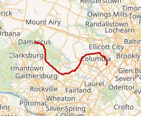 Maryland Route 108 (MD 108) is a state highway in the U.S. state of Maryland. The highway runs 34.23 miles (55.09 km) from MD 27 in Damascus to MD 175 in Columbia. MD 108 is an S-shaped highway that winds through the northern Montgomery County and central Howard County. The highway connects the Montgomery County communities of Laytonsville, Olney, Sandy Spring, and Ashton with the Howard County villages of Highland and Clarksville. MD 108 serves as the northern edge of Columbia and connects several of the planned community's suburban villages.