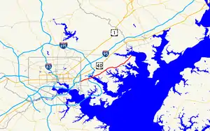MD 150 is known as Eastern Avenue from just west of I-895 in Baltimore to the Back River between Dundalk and Essex. The highway is also named Eastern Avenue from Carroll Island Road in Middle River to the highway's eastern terminus in Chase. Between the two sections of Eastern Avenue, MD 150 follows Eastern Boulevard through Essex and Middle River. The state highway is maintained by the Baltimore City Department of Transportation in the city of Baltimore and by the Maryland State Highway Administration in Baltimore County.[1][2] MD 150 is a part of the National Highway System as a rail-to-truck intermodal freight transport connection from its western terminus at US 40 to I-95 within Baltimore.[1][3] The highway is also a National Highway System principal arterial from I-95 to Carroll Island Road in Middle River.[2][3]