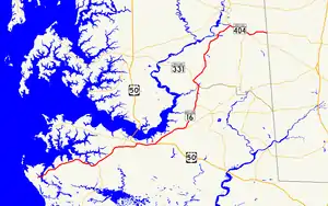 Maryland Route 16 (MD 16) is a state highway in the U.S. state of Maryland. The state highway runs 51.06 miles (82.17 km) from Taylors Island east to the Delaware state line in Hickman, where the highway continues as Delaware Route 16 (DE 16). MD 16 connects Cambridge with several communities in northern Dorchester County and southwestern Caroline, including East New Market and Preston. The state highway runs concurrently with U.S. Route 50 (US 50) near Cambridge, MD 331 between East New Market and Preston, and both MD 404 and MD 313 near Andersontown. MD 16 was constructed between Church Creek and Preston as one of the original state roads in the early and mid-1910s. The highway was extended in both directions in the late 1910s: north to what was to be designated MD 313 near Denton and west to Taylors Island. MD 16 was extended through Andersontown to the Delaware state line in the early 1930s. MD 16's bypass of Cambridge was constructed in the mid-1960s.