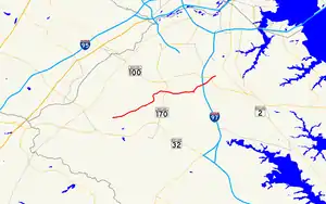 When the Maryland State Roads Commission applied numbers to state highways, they assigned MD 170 to its current corridor from Severn to Brooklyn Park and to what is now MD 174 from Severn to Fort Meade.[3][4] The portion of the modern highway from Odenton to Severn was originally MD 554.[4] A section of highway from the current MD 170–MD 174 intersection in Severn west to the Pennsylvania Railroad (now Amtrak's Northeast Corridor) was built as a 14-foot (4.3 m) wide concrete road by 1915.[5] Construction on the highway from Linthicum to Fort Meade became a high priority with the United States' entrance into World War I; the remainder of the Severn–Linthicum highway and the highway from the railroad at Severn southwest to newly established Camp Meade, now collectively called the Camp Meade Road, were paved in 14-to-16-foot (4.3 to 4.9 m) wide concrete between 1916 and 1919.[6]