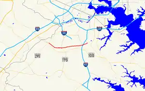 MD 176 was widened and resurfaced over its whole length between 1947 and 1950.[12][13][14] The highway was expanded to a width of 22 feet (6.7 m) from Dorsey to Harmans and to 24 feet (7.3 m) from Harmans to Glen Burnie.[12] The MD 295–MD 176 interchange was built as a diamond interchange between 1950 and 1953; a loop ramp from eastbound MD 176 to northbound MD 295 was added in 1956.[15][16] The highway's interchange with the Glen Burnie Bypass, which started as US 301, became MD 3, and is now I-97, was constructed as a diamond interchange between 1954 and 1956.[15][16] MD 176 was expanded to a divided highway on either side of its interchange with MD 3 (now I-97) by 1978.[17] The remainder of MD 176 from the west end of the divided highway to just east of MD 295 was expanded to four lanes in the late 1980s, with the bridge of Piney Run between MD 295 and MD 713 rebuilt in 1987 and the railroad overpass at Harmans rebuilt in 1989.[18][9]