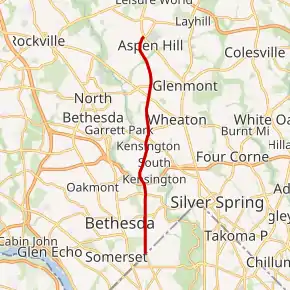 After leaving the town limits of Kensington, MD 185 becomes a six-lane controlled access divided highway passing between residential subdivisions.[1] After crossing a tributary of Rock Creek, the state highway intersects MD 586 at an acute intersection.[2] MD 185 then becomes lined with service roads ahead of and after the intersection with Randolph Road.[2] Beyond Weller Road, the state highway crosses Turkey Branch and then a bridge over Matthew Henson State Park.[2] MD 185 then enters Aspen Hill and intersects Aspen Hill Road within a commercial area.[2] The state highway meets its northern terminus at MD 97 (Georgia Avenue). Connecticut Avenue continues as a county-maintained highway north across Bel Pre Road into Rossmoor, home of the Leisure World retirement community.[2]