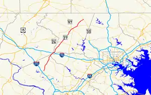MD 27's original interchange with I-70 was constructed when US 40 was relocated as a four-lane divided highway through Ridgeville in 1953 and 1954.[24] This interchange was a four-ramp partial cloverleaf along the line of Mount Airy's Main Street directly on the Carroll– Frederick county line.[25] MD 27's bypass of Mount Airy was constructed from Dorceytown south to Ridgeville Boulevard in 1972.[30] MD 27's I-70 interchange was reconstructed to its present six-ramp partial cloverleaf design slightly to the east of the old interchange as part of I-70's upgrade to Interstate standards in 1975.[31] MD 27's bypass of Mount Airy was completed from Ridgeville Boulevard south to the I-70 interchange in 1977; MD 808 was marked on Main Street by 1978.[32][33] MD 27 was relocated at its southern end as a divided highway from MD 355 to Brink Road between 1993 and 1996.[34][35] This work was part of a state– county project to connect Ridge Road and Father Hurley Boulevard with I-270 to improve access between I-270, Germantown, and Damascus.[35] The old segment of MD 27 became Henderson Corner Road.[36]