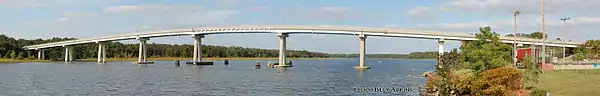 In 1972, MD 404 and MD 313 were relocated to a one-way pair, eastbound Franklin Street and westbound Gay Street, through Denton. The routes previously headed south out of Denton on Sixth Street and Fifth Avenue. The former alignment along Sixth Street became MD 619 by 1978.[15][16] In the early 1980s, construction began to widen MD 313/MD 404 to a divided highway around Denton.[17] By 1985, construction was underway for the four-lane divided bypass of Denton between MD 404 west of Denton and MD 313 north of Denton.[18] In 1987, MD 313 and MD 404 were rerouted to bypass Denton along the newly completed four-lane divided bypass. The former alignment of MD 313 through Denton became MD 404 Bus. along Franklin and Gay streets and MD 619 along Sixth Street. In 1987, MD 313 was moved to a bypass to the north and east of Sharptown, having previously followed State Street through the town.[19] A superstreet intersection was built at US 301 in 2000, resulting in the northern terminus of MD 313 being officially moved to US 301 and the portion of the route between US 301 and MD 213 being designated MD 313A.[20] The divided highway portion of MD 313/MD 404 in the Denton area was extended further in the 2000s from the south end of Denton to the Sennett Road intersection east of where MD 16 joins the two routes.[21] The section between south of Legion Road and Double Hills Road was widened in 2005 while the section between Double Hills Road and Sennett Road was widened in 2007.[22] This project received $3 million from the federal government in 2001.[23] The remaining two-lane portions of MD 313 that are concurrent with MD 404 are slated to be widened into a four-lane divided highway in order to provide relief to travelers driving to the ocean resorts along MD 404.[24] The Federalsburg Bypass bridge over Marshyhope Creek, which was originally built in 1962, was rehabilitated in 2012.[25][26] During the project, which replaced the bridge's deck, alternating one-way traffic crossed the bridge directed by traffic lights at either end of the construction area.[26]