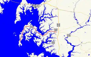 After a new, straighter US 213 (replaced by US 50 in 1949) was completed from south of Easton to Wye Mills in 1948, MD 33 was extended north along Washington Street within Easton to the new bypass.[17][18][19] Following the closing of the Claiborne–Romancoke ferry in 1953, MD 33 and MD 451 switched alignments in 1957; MD 33 achieved its present western terminus at Tilghman Island while MD 451 became a short highway from MD 33 to Claiborne.[20][21] MD 33 between Romancoke and Matapeake was redesignated MD 8 in 1960.[22] MD 451 was removed from state maintenance in 1998.[23][24]