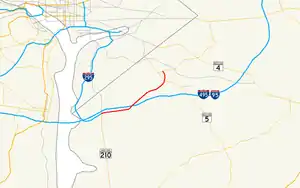 MD 414 was widened and resurfaced from MD 210 to MD 5 at Gordon's Corner in 1949 and 1950.[12] In 1952, MD 5 was relocated to its present divided-highway alignment through Silver Hill.[13][14] MD 414 was extended north along MD 5's old alignment to its current eastern terminus.[14][15] The portion of the state highway from Oxon Hill Manor to MD 210 was transferred to county maintenance in 1955.[16] MD 414's and MD 210's interchanges with the Capital Beltway opened in 1964.[17] The Beltway's MD 210 interchange was a full cloverleaf with the straight ramps to and from northbound I-495 ending at intersections with MD 414. The Beltway's MD 414 interchange originally included only a straight ramp from westbound MD 414 to southbound I-495 and a loop ramp from northbound I-495 to eastbound MD 414.[15] Four ramps were added to the Beltway–MD 414 interchange in 1981; the remaining two ramps, both in the northeast quadrant, were added in 1983.[18][19]
