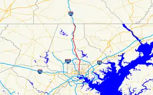 Further widening of US 111 was not planned because York Road was to be bypassed by a freeway between Baltimore and Harrisburg. Construction on the Baltimore– Harrisburg Expressway got underway in 1948 between Timonium and Hunt Valley.[19] The first portion of the freeway opened from Towson to Belfast Road north of Hunt Valley in December 1955, concurrent with the opening of the portion of the Baltimore Beltway between Falls Road and York Road.[20] US 111 was moved to the freeway when the Baltimore– Harrisburg Expressway was completed to the north of Hereford in 1957; MD 45 was assigned to York Road between the Beltway and the northern end of the freeway.[20][21] A second, disjoint portion of MD 45 was assigned from north of Parkton to the Pennsylvania state line when the Baltimore– Harrisburg Expressway was completed between Parkton and the York area in 1959.[20][22] When the final section of the US 111 freeway was completed between Hereford and Parkton in 1960, MD 45 was assigned to the stretch of York Road between those communities.[20][23] US 111 and I-83 were co-signed on the freeway between Towson and Harrisburg until US 111 was decommissioned in 1963; the MD 45 designation was extended south into Baltimore to US 1 at that time.[24]