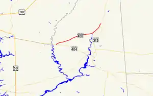 MD 480 was under construction from Ridgely to Greensboro by 1932 and completed in 1933.[3][4][5] The state highway originally followed Central Avenue in Ridgely south from MD 312, then turned east onto Sixth Street toward Greensboro. In Greensboro, MD 480 had its eastern terminus at present-day MD 314. MD 480 north to its present eastern terminus and MD 314 east across the Choptank River were originally part of MD 313.[6] When MD 313 bypassed Greensboro in 1950, MD 480 was extended north through Greensboro to its present terminus.[7] When the Ridgely Cutoff was completed in 1953, MD 312 replaced MD 480 on Central Avenue.[8][9] MD 480's western terminus was the intersection of Central Avenue and Sixth Street until MD 480 was extended west to MD 404 in Hillsboro in 1959.[10]