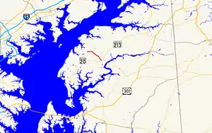 In 1948, Kent County requested that the Maryland State Roads Commission make improvement of Flatland Road its highest priority project in the county during the post–World War II road building effort.[3] The highway from MD 20 to Hanesville Road was constructed in two sections. The first 2.25-mile-long (3.62 km) section was built as a gravel road in 1949, and the gravel road was improved with bituminous stabilization the following year.[4][5] MD 514 was extended to Hanesville Road as a gravel road in 1954.[6] The highway was resurfaced with bituminous concrete in 1970.[7] Melitota Road was transferred from county to state maintenance through a December 1, 1987, road transfer agreement, and the road was confirmed as an extension of MD 514 in July 1988.[8][9]
