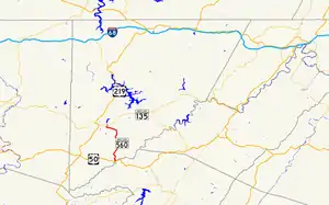 MD 560 was constructed beginning in 1930 from both the Loch Lynn Heights and Gorman ends.[3] By 1933, the state highway was paved from US 50 north to Le Moyne King Road, and from MD 41 (now MD 135) south to Bethlehem Road just north of Backbone Mountain.[4] The northern section was extended over Backbone Mountain to White Church Steyer Road at Kearney by 1939.[5] MD 560 was a two-part route until the gap between Le Moyne King Road and Kearney was filled in 1949.[6][7]