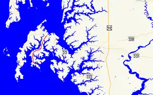 MD 579 begins at the beginning of state maintenance at the southern end of the village of Neavitt. Long Point Road continues south 0.49 mi (0.79 km) to its southern terminus, and another road continues south a short distance further to Long Point. MD 579 heads northwest as a two-lane undivided road through Neavitt, which sits on Balls Creek to the northeast. The state highway curves north after leaving Neavitt and passes Wells Point Lane, which leads to the Jean Ellen duPont Shehan Audubon Sanctuary. MD 579 continues north through a mix of farms and residences on large, waterfront lots, curving northeast around the head of Leadenham Creek and into the village of Bozman. Within Bozman, the state highway intersects Bush Neck Road, which leads to Bush Neck and the Cooper Point peninsula, which flank Grace Creek. MD 579 heads north out of Bozman, passing through the narrow neck of land between Harris Creek and Broad Creek before reaching the highway's northern terminus at MD 33 (St. Michaels Road) northwest of the town of St. Michaels.[1][2]