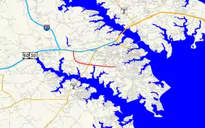 MD 665 begins at a directional interchange with US 50/US 301 and unsigned I-595 (John Hanson Highway) in Parole. The ramps from MD 665 to westbound US 50/US 301 and from eastbound US 50/US 301 to MD 665 tie into the ramps for I-97. The ramp from westbound US 50/US 301 to MD 665 forms a sweeping hairpin. MD 665 heads southeast as a four-lane freeway through a single-point urban interchange with Riva Road. The highway turns east and meets MD 2 (Solomons Island Road) at a partial cloverleaf interchange. There is also an exit ramp from westbound MD 665 to Annapolis Harbour Center Drive, which accesses the eponymous shopping center in the northwest quadrant of the interchange. Beyond MD 2, the state highway crosses Church Creek, enters the city of Annapolis, and becomes a four-lane divided highway with partial access control. After an intersection with Chinquapin Round Road, which is unsigned MD 665C, MD 665 reaches its eastern terminus at Bywater Road. The roadway continues southeast as Forest Drive, a four-lane road with a center turn lane. Forest Drive intersects MD 387 (Spa Road) and Bay Ridge Avenue on its course along the southern fringe of the city of Annapolis.[1][2]