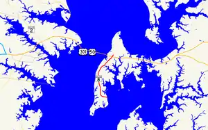 In 1949, US 50 was extended east of Annapolis and replaced MD 404 west of Wye Mills. As a result, the highway between Matapeake and Stevensville became US 50.[9] When the Chesapeake Bay Bridge was completed in 1952, US 50 followed a new divided highway east toward Queenstown. MD 33 was extended north from Matapeake to MD 18 in Stevensville.[10] The Romancoke–Claiborne ferry was discontinued by 1954, but MD 33 remained on Kent Island until it was replaced with the MD 8 designation in 1960.[11][12] MD 8's interchange with US 50 and US 301 was completed by 1987. A divided highway, Business Parkway, was completed at the same time from south of the interchange to Love Point Road where MD 18 presently intersects MD 835C north of the Stevensville Historic District.[13] MD 8's northern terminus moved south to its present location when MD 18 was extended west to Business Parkway in 1989.[14]