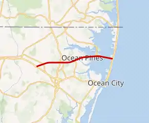 MD 90 continues east through Ocean Pines, where the highway has a diamond interchange with MD 589 (Racetrack Road) and passes over Ocean Parkway within that community. The median barrier ends and the state highway becomes an undivided highway again immediately before crossing the St. Martin River on a long bridge. A median returns right after the bridge ends at Isle of Wight, where MD 90 has an at-grade signalized intersection with St. Martins Neck Road and the entrance to Isle of Wight Nature Park. MD 90 becomes undivided again for the Assawoman Bay Bridge over the Assawoman Bay. After that bridge, the state highway expands to four lanes with a Jersey barrier for a short distance before its terminus at a signalized intersection with MD 528 (Coastal Highway) at 62nd Street in the Midtown section of Ocean City.[1][2]