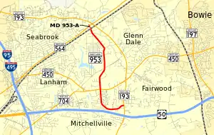 MD 953A is the unsigned designation for Glenn Dale Road, a 0.13-mile (0.21 km) section of old alignment of MD 193 that runs between two dead ends on the north side of Amtrak's Northeast Corridor. MD 953A has an intersection with MD 564 (Lanham Severn Road) and provides access to the Glenn Dale post office.[1][14]