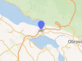 Approximately 1.5 km (0.93 mi) to the south, there is another bridge, carrying D8 state road across the same strait, and this was the original crossing point over the strait.[4] Although that is a completely different structure, carrying a different road, that bridge is also officially called Maslenica Bridge.[5] The bridge carrying the A1 motorway is actually older than the one carrying the D8 road, however since the latter is a replacement for a bridge destroyed in the Croatian War of Independence in 1991, both A1 and D8 bridges are known to be referred to as both old and new Maslenica Bridge.[5][6][7]