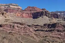 Masonic Temple is a 6,242-foot-elevation (1,903 meter) summit located in the Grand Canyon, in Coconino County of northern Arizona, US.[2] Set below Dutton Point on the Powell Plateau, and overlooking the Shinumo Amphitheater, it is situated three miles west of Holy Grail Temple, 2.7 miles northwest of Dox Castle, and 1.6 miles north-northeast of Fan Island. Topographic relief is significant as it rises 4,000 feet (1,220 meters) above the Colorado River in four miles (6.4 km). According to the Köppen climate classification system, Masonic Temple is located in a cold semi-arid climate zone, with precipitation runoff draining south to the Colorado River via Hakatai Canyon from the west aspect, Burro Canyon from the south aspect, and Muav Canyon from the east aspect.[4] This butte is an erosional remnant composed of strata of the Pennsylvanian-Permian Supai Group overlaying the conspicuous cliffs of Mississippian Redwall Limestone, in turn overlaying the Cambrian Tonto Group.[5]