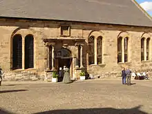 The architectural spaces of August 1594 can still be explored and experienced by visitors today. The Chapel Royal was purpose-built in 1594 under the direction of William Schaw, who was Master of Work to the king and the queen, and an administrator of the queen's landed income.[100] Some of the timber was selected on the Shore of Leith by the king's carpenter James Murray, elder.[101] The building has a central triumphal arch as an entrance, flanked by Italianate windows, and can be described as the first Renaissance style church in Britain.[102] The north façade is featureless. An older chapel on the site was judged inadequate for its bad proportions by a previous Master of Work Robert Drummond of Carnock in May 1583.[103] Ian Campbell and Aonghus MacKechnie argue that the proportions of the new building and a partition or barrier in the original interior mentioned by William Fowler matched ratios in the Bible for the measurements of the Temple of Solomon.[104] James VI had been compared to Solomon by his courtiers and poets, and while the chapel was being built John Colville described it in a letter as "the great Temple of Solomon".[105] However, this connection was not developed in William Fowler's description of the baptism pageant. Campbell and MacKechnie propose that the physical embodiment of the Temple in the architecture, rather than the allusion to kingship made by Colville, was a secret kept by the masons.[106]