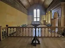 The buildings that formed the backdrop for the events of the baptism are still intact with few external changes since 1594. The interiors of the Great Hall, Chapel Royal, and Palace have been returned to their original layout and proportions, and subdivisions made during the later use of the castle as army barracks removed. The rooms in the palace were restored in 2010.[97] Painted decoration surviving in the Chapel Royal by Valentine Jenkin mostly dates from 1629 and shadow traces of paintwork from 1594 can be seen on the exterior around the windows.[98] No furnishings from 1594 are known to survive, except a plain oak pulpit possibly used by Patrick Galloway and David Cunningham, which is stored by Historic Environment Scotland.[99]