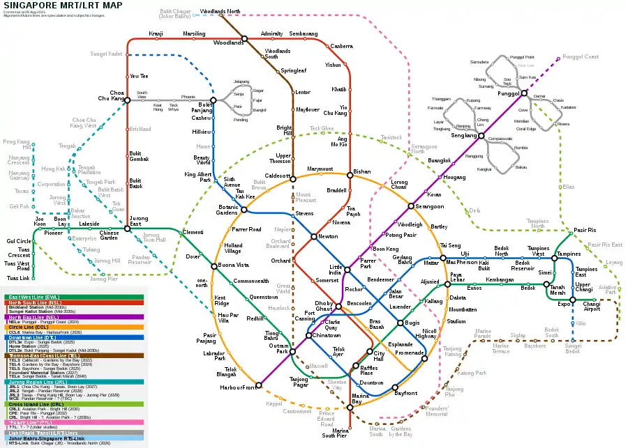 The MRT network encompasses 216 km (134 mi) of grade-separated route on standard gauge. There are 127 operational stations (28 of which are interchange stations) dispersed across six lines arrayed in a circle-radial topology. The network is scheduled to double in length to 400 km (250 mi) by 2040 as a result of ongoing extension works to its existing lines and the construction of three new lines.[4] The island-wide heavy rail network interchanges with a series of automated guideway transit networks localised to select suburban towns—collectively known as the Light Rail Transit (LRT) system—that complement the mainline by providing a last mile link between MRT stations and HDB public housing estates.[5] The network is additionally scheduled to interchange with the Johor Bahru-Singapore Rapid Transit System that will traverse the Johore Strait once completed, connecting Singapore with the southern Malaysian city of Johor Bahru.