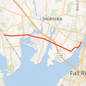 Massachusetts Route 103 is a continuation of R.I. Route 103. It begins in Swansea at the Warren line, heading eastward as Wilbur Avenue. It crosses the Cole River before entering the village of Ocean Grove. As the route enters Somerset it crosses the Lees River, just east of its junction with Exit 4 of I-195. (Part of the exit structure is linked to Lees River Avenue, which ends at Route 103 just west of the rest of the exit.) From there it continues eastward, north of Brayton Point and the Dominion Resources power station before Wilbur Avenue turns northward, intersecting with Riverside Avenue at the end of Brayton Avenue, where all three roads formerly met the Slade's Ferry Bridge. Route 103 then continues northward along Riverside Avenue to its end at intersection with the former alignment of U.S. Route 6 and Route 138 just west of the former Brightman Street Bridge, before US Route 6's realignment to the new Veteran's Memorial Bridge. Route 138 continues northward along Riverside Avenue from the new bridge, creating a gap between the end of 103 and the northward curve of 138.
