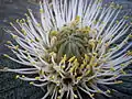 Massonia pustulata, the blistered massonia, is a species of flowering plant in the family Asparagaceae, subfamily Scilloidiae, native to the Western Cape of South Africa. Growing to 10 cm (3.9 in) tall and broad, it is a small bulbous perennial with two horizontal, opposite leaves, and virtually stalkless cream or pink flowers in winter. The stamens are longer than the perianth, giving the flower the appearance of a rounded, spiky brush-head.[3] The deep “pock marks” on the leaves give the plant its common name, as well as the specific epithet pustulata.