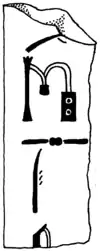 Relief "Cairo Museum CG 1426" is well-preserved. It shows Hesy-re sitting at an offering table. All other panels show him standing opposite it (at least in the well preserved ones). In this panel, he wears a long tight garment, which covers his left shoulder but leaves the right one free. On the left shoulder is some kind of knot. The garment reaches down to his ankles. In his left hand, Hesy-re holds two rods. Scribal utensils hand from his right shoulder. These consist of an inkpot with two holes for red and black paint, a reed writing stick and a bag. Hesy-re's right arm is extended toward the offering table. The offering table reaches up to his left. On the actual offering plate are eight loaves of bread. Directly above the table is a short offering list, including wine, incense, cool water, beef(?) meat and antelope meat. In the upper part of the relief is a full list of Hesy-re's titles: Chief dentist,[6] Heka Priest of Mehyt, Elder of Qed-hetep,[7] He who sees Min,[8] Acquaintance of the King, Overseer of the Craftsmen of the King, Great one of the Headscarf (?),[9] Father of Min, Overseer of the Cult Building of Mehyt, Great one of Buto,[10] Foremost of the Couriers (?),[11] Great One of the Ten of Upper Egypt, Priest of Horus of the Harpoon-place of Buto (?).[12]