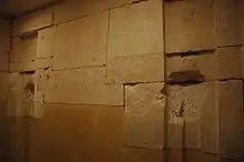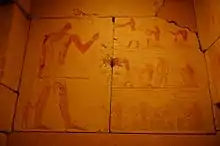 The small south wall contains a list of offerings and a dining scene. The offering list consists of eight registers, in which the captions are arranged from left to right in short vertical columns without dividing lines. The dining scene is at the right hand side of the lower four registers. In the ritual offering lists, the offerings and ritual actions are noted, which were carried out in the regular funerary cult at the tomb. They begin with the list of the entrance rites, which were carried out by the funerary priest, like the purification of the cult space by sweeping and pouring water, washing hands, burning incense and supply of the seven holy oils and anointments. After this follows the list of foods and drinks which were to be brought in a defined order. These consist of various kinds of breads, cakes, meats, poultry, fruit and vegetables. Only fragments of the dining scene survive.[10]