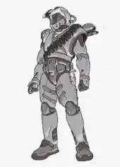 The task of developing Master Chief for the character's first video game appearance in developer Bungie's Halo: Combat Evolved (2001) fell on art director Marcus Lehto and Robert McLees. Shi Kai Wang was later hired for conceptual art.[3] One of Wang's sketches became the basis for Master Chief, but the initial translation of the drawing into a three-dimensional model looked too slim and anime-inspired.[3] Lehto felt the character needed to feel more like a walking tank, and the design was bulked up.[4] The Chief's armor went through various changes, such as the addition (and later removal) of an antenna, and a green tint.[5] The character's two-prong visor, intended to convey speed and agility, was inspired by BMX helmets.[6]
