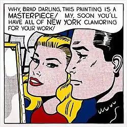 Masterpiece is regarded as a tongue in cheek joke that reflects upon Lichtenstein's own career.[5] In retrospect, the joke is considered "witty and yet eerily prescient" because it portended some of the future turmoil that the artist would endure.[7] In the painting, the blonde female's speech bubble, "Why, Brad darling, This painting is a masterpiece! My, soon you'll have all of New York clamoring for your work!" conveys her remark as she gazes at the painting, of which a corner of the back is shown. Silent Brad conveys his agreement by his facial expression.[9] Adrian Searle of The Guardian says that the 1962 work, whose narrative and graphical content were both borrowed, was timely because Lichtenstein had his first exhibition in New York City at Leo Castelli Gallery that year, making the painting aspirational in an ironic way that comments on success and "the socio-sexual status of the hot young artist".[9] The satirical commentary on Lichtenstein's career, followed the inside joke made the year before in Mr. Bellamy.[12] According to Roberta Smith of The New York Times, Masterpiece was one of Lichtenstein's works created in a way that produced "faint and uneven" Ben Day dots.[13]