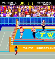 The game is presented in the guise of a televised pro-wrestling broadcast, the Taito Wrestling Association (TWA) (Technos Wrestling Association in the Japanese version). The intro sequence and subsequent intermissions portray a disheveled pro-wrestling host, Cory (Nari in the Japanese version). His hair is unkempt and his sleeves rolled up as he manically announces the particulars of the upcoming bout.
